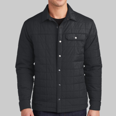 Midweight jacket warmth meets collared shirt style in this shirt jac that blurs the line between the great outdoors and indoors. Snap-front closure and snap cuffs. Drop-in left chest pocket. Contrast Eddie Bauer heat transfer logo on the right hem. Decoration access pocket. Made of 100% polyester fabric and 1.8-ounce, 100% polyester fill. Water-resistant with a PU coating.